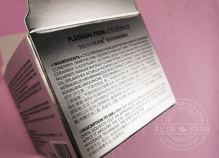 這款眼部精華銀卡彩盒SIENNR,用銀卡材質(zhì)生產(chǎn)而成,銀卡反光強烈,啞光磨砂效果,會緩和很多,內(nèi)托用紙內(nèi)托,很好的保護(hù)和托住產(chǎn)品,輕盈簡潔的感覺,帶來小巧精致的感受。