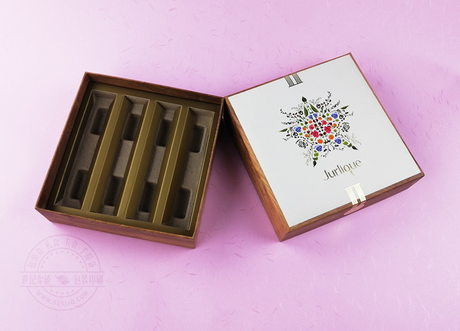 茱莉蔻(Jurlique)品牌合作的護膚系列禮盒包裝,選用4色印刷在特種紙上,木紋圖案印在特種紙紋上,突出木紋效果,逼真手感,logo燙金,金木兩種不同質(zhì)感搭配,體現(xiàn)獨特品味。內(nèi)襯以木漿紙和卡紙配合組成適合產(chǎn)品的卡托,品質(zhì)細膩。