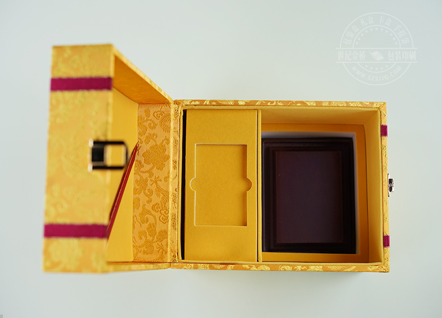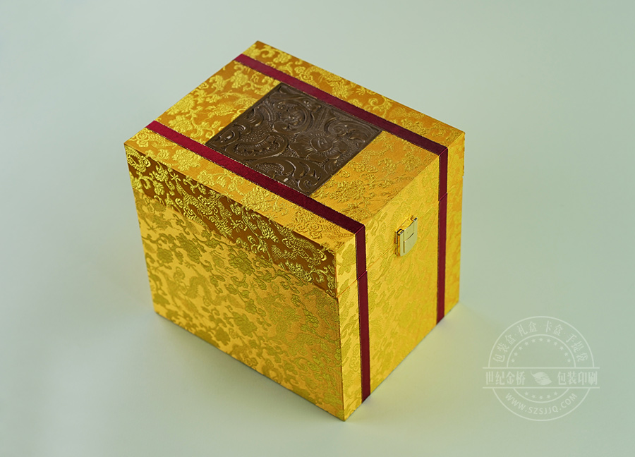 (抽屜盒+特種紙+燙金+擊凸+裱定型板+內(nèi)配金色綢布內(nèi)托+盒面貼金屬貼牌)