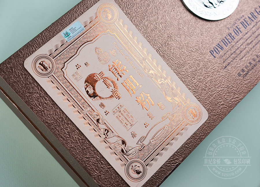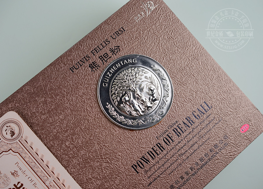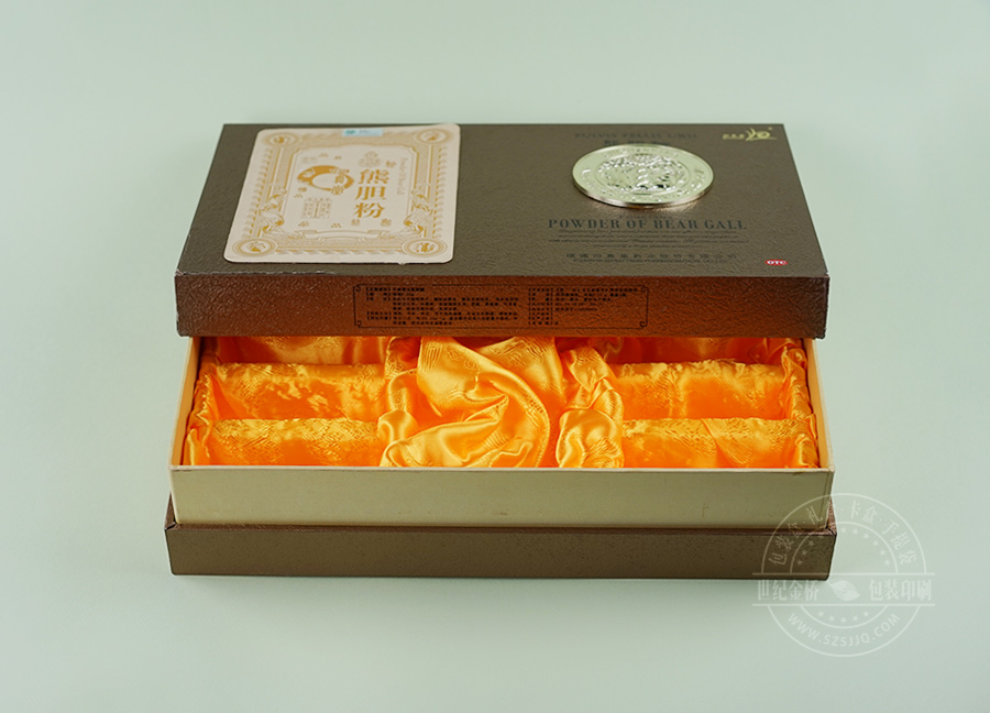 (抽屜盒+特種紙+燙金+擊凸+裱定型板+內(nèi)配金色綢布內(nèi)托+盒面貼金屬貼牌)