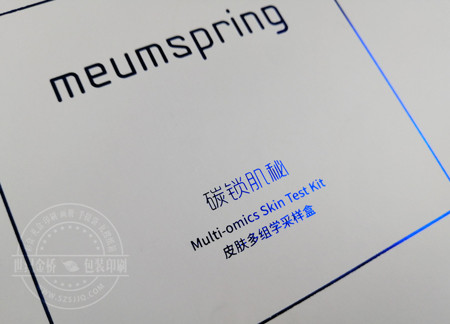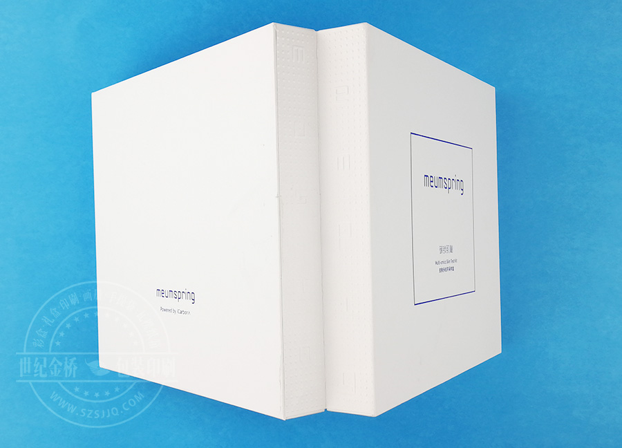MEUMSPRING護膚禮盒套裝,翻蓋盒的造型開啟更方便,灰卡配雙銅,外燙藍光,神秘效果體現(xiàn)的很好,側(cè)面壓印痕,類似書脊效果,科技文化醫(yī)療技術(shù)合成的護膚包裝盒,讓客戶安心購買使用。