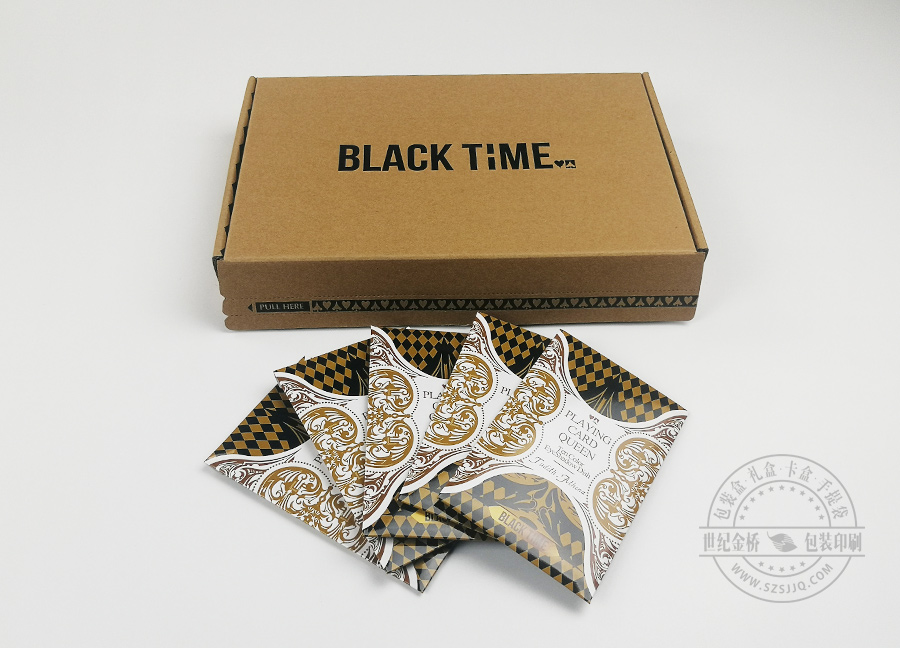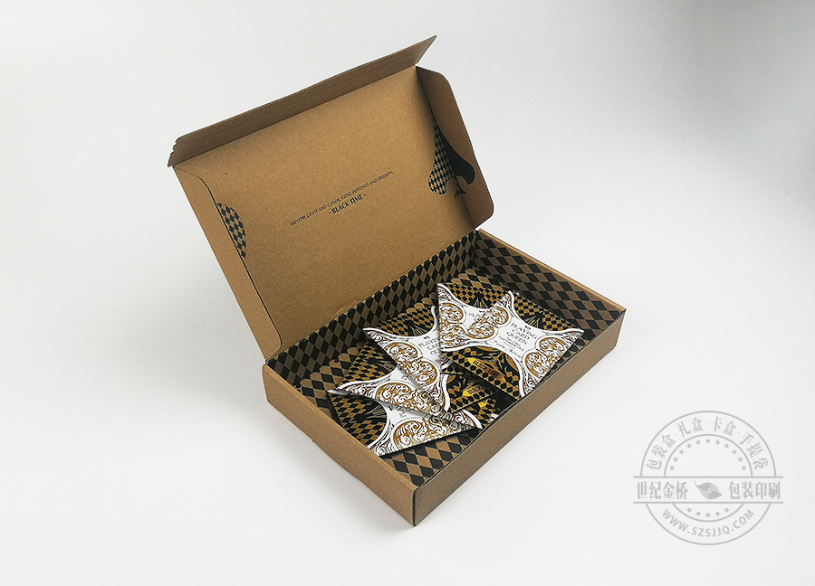 這是一款文化娛樂撲克牌禮盒,瓦楞紙盒定制而成,坑紙裱牛皮質(zhì)單色印刷,一體而成,展開可以平鋪,對于外貿(mào)貨運(yùn)來說,有巨大的物流優(yōu)勢,坑紙外裱單面灰板,沖型便會成型,材料和加工都較為簡單,做大件商品的包裝盒較為合適。